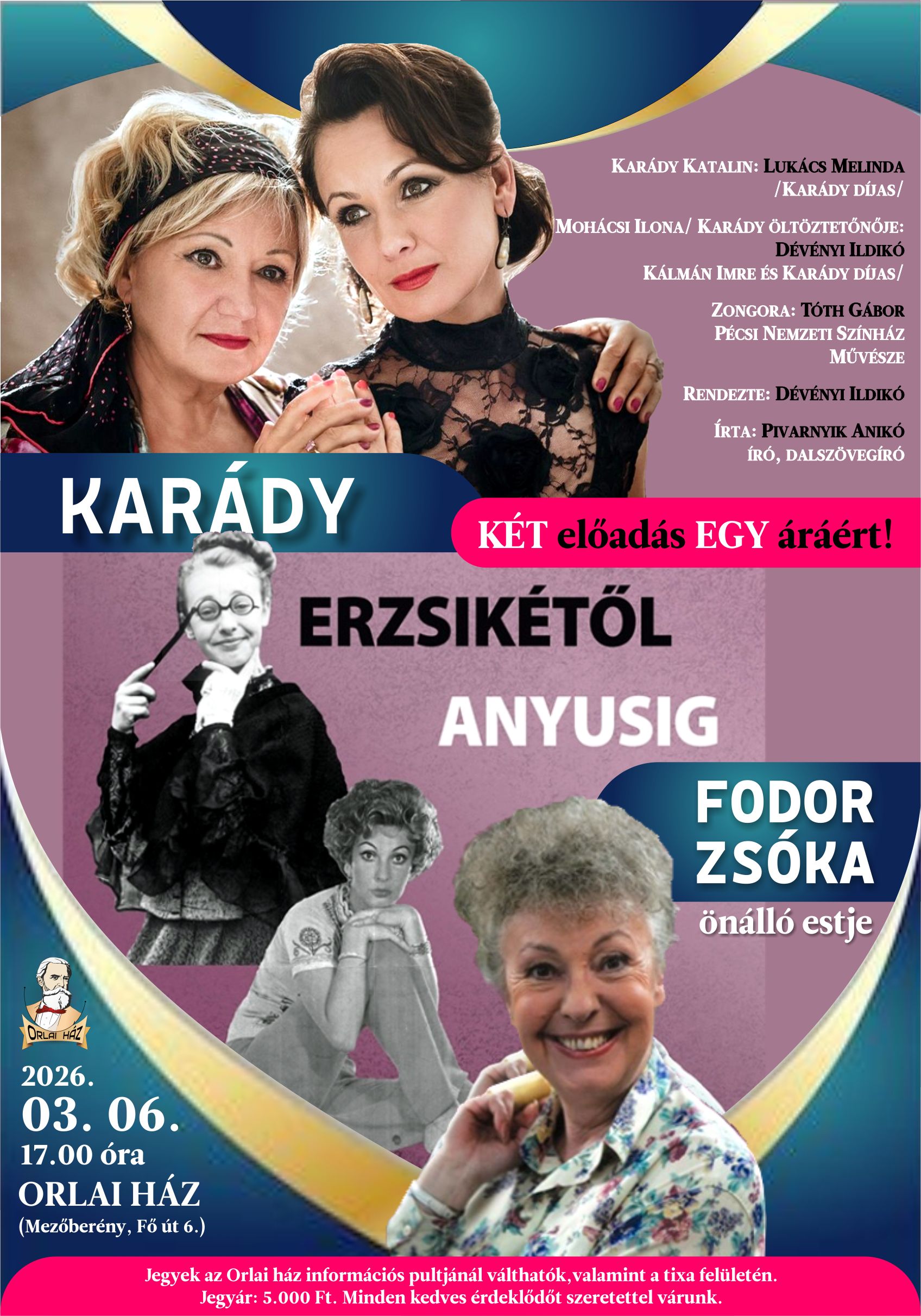 Cseke Katinka és Zsiga László zenés kabaréestjét Böbe mindent elintéz címmel 2024. május 30-án láthatták a nézők az Orlai ház színpadán. Cseke Katinkát a legtöbben a Jóban Rosszban sorozatból ismerik, Zsiga László három évtizede szerepel színpadon, prózai és zenés darabokban egyaránt.
