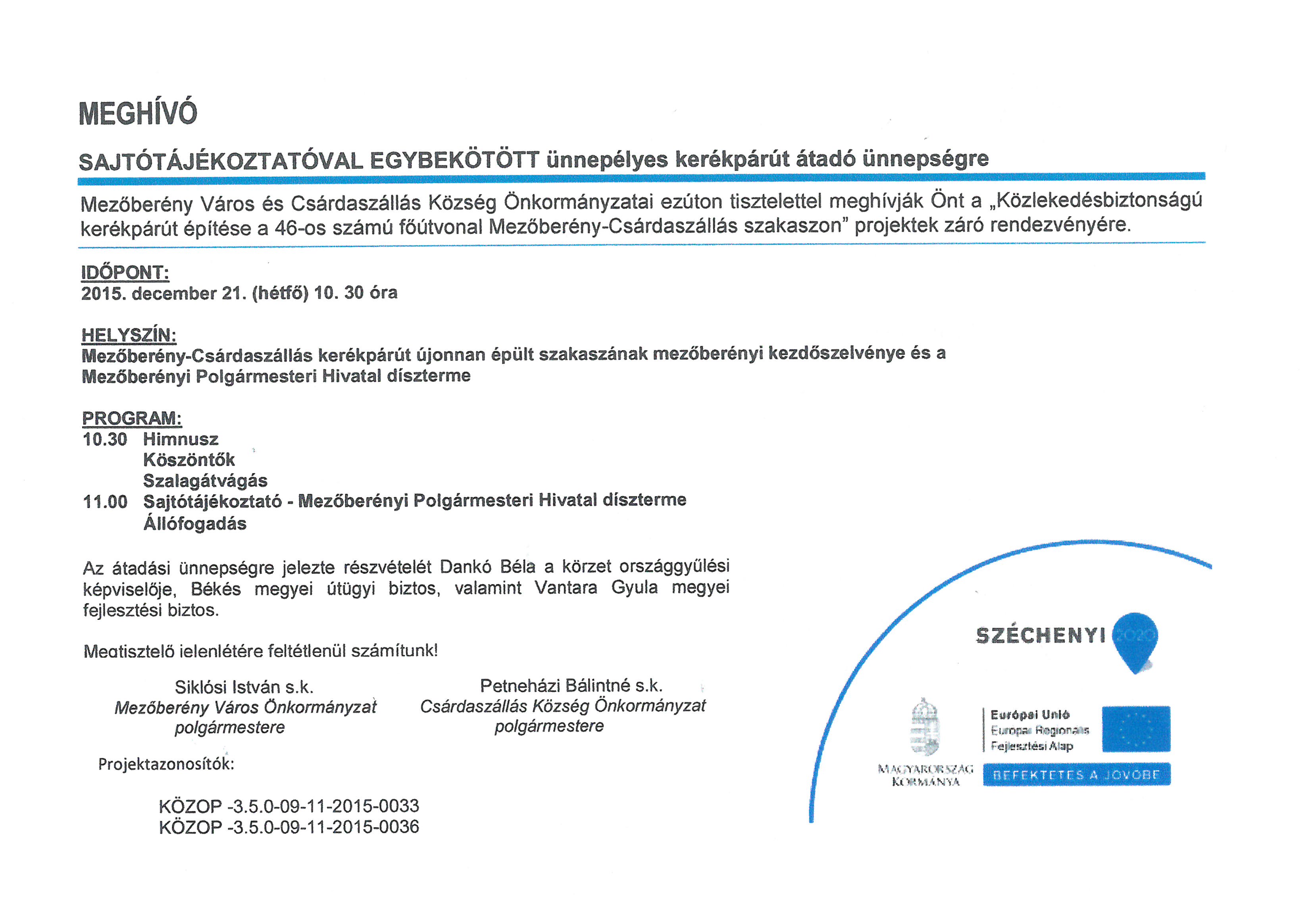 2015. december 21-én 10.30 órától kerül sor a "Közlekedésbiztonságú kerékpárút építése a 46-os számú főútvonal Mezőberény - Csárdaszállás szakaszon" projektek záró rendezvényére.